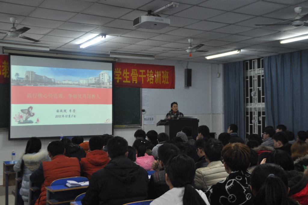 2015年12月8日晚,beat365英国官方网站“青马工程”培训第四讲在E102教室开展,beat365英国官方网站党总支书记李芳老师作了题为“践行核心价值观,争做优秀国教人”的讲座。