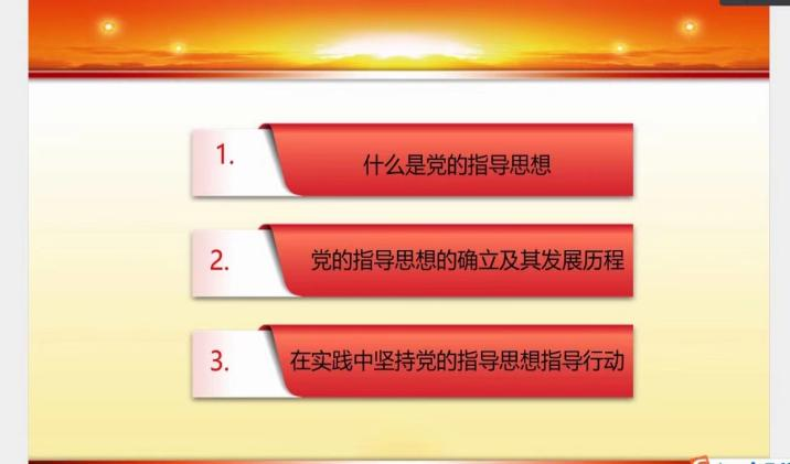 本次党课培训以“党的指导思想”专题党课讲授。侯老师从“什么是党的指导思想”“党的指导思想的确立及其发展历程”“在实践中坚持党的指导思想指导行动”三个方面为大家进行讲解。首先,侯老师向大家系统地阐述了什么是党的指导思想,她强调,中国共产党以马克思列宁主义,毛泽东思想,邓小平理论,“三个代表”重要思想,科学发展观,习近平新时代中国特色社会主义思想作为自己的行动指南。通过讲解党的指导思想的发展历程,使学员们充分理解党课的重要意义。