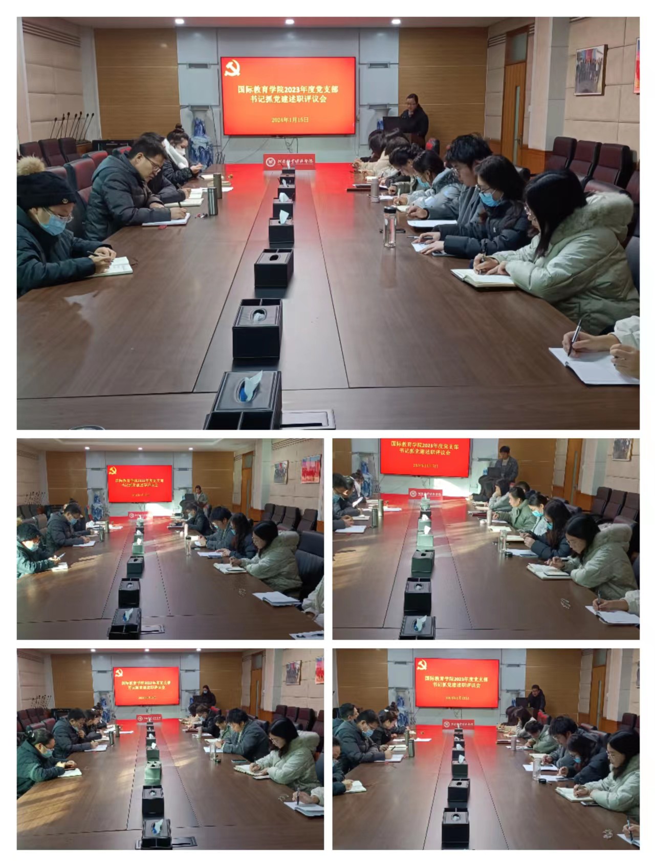 院党委书记贾江对各党支部书记的汇报依次进行了点评,他充分肯定了各党支部2023年取得的成绩,并结合当前学校党建工作形势和任务对各支部提出了四点具体要求:一是要进一步强化以党建工作为龙头的意识,牢固树立抓党建就是最大政绩的观念,真正从思想上重视党建工作,增强做好基层党建工作的信心。二是进一步提高党建工作的质量,按照“两化一创”的要求,争当“样板党支部”。三是要进一步发挥党支部的战斗堡垒和党员的先锋模范作用,开展好“树旗帜”活动,发挥好“头雁效应”。四是要进一步树立“围绕发展抓党建,抓好党建促发展”的理念。把党建工作与日常工作紧密结合,用党建工作的成效推动各项工作发展,用各项工作的发展检验党建工作的成效。他强调,各党支部要深入学习贯彻党的二十大精神,不断提高政治站位,加强党员队伍建设,为学校的发展贡献更多的力量。最后,参会的院党委委员对各党支部书记抓党建述职工作进行了评议考核。
