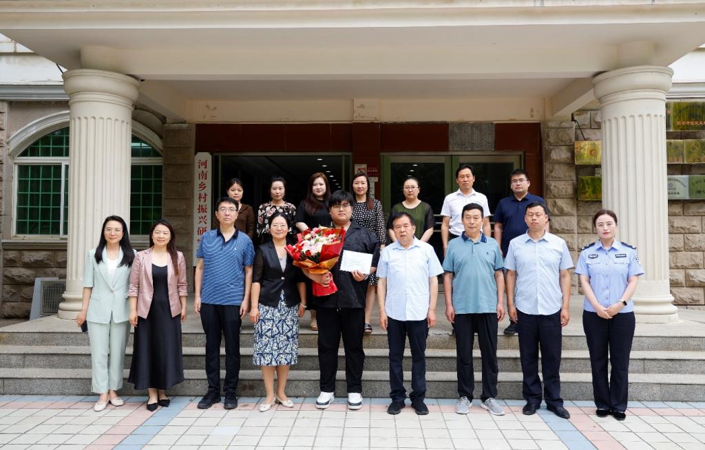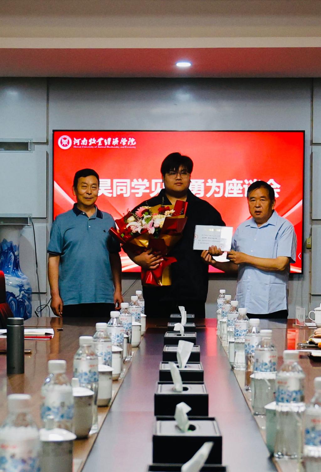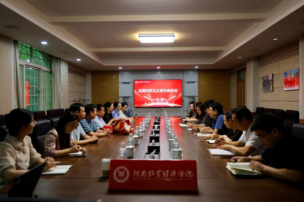 5月30日上午,沁阳市见义勇为协会会长李卫星、副会长杨旗洲一行四人来校为beat365英国官方网站2021级大数据技术(专)02班刘昊同学颁发沁阳市见义勇为奖,双方并组织召开座谈会。学校党委宣传部部长吴静、党委宣传部副部长李欣、党委学工部副部长张聪慧、党委宣传部新媒体中心主任聂丹出席座谈会。beat365英国官方网站领导班子成员及相关师生代表参加会议。会议由beat365英国官方网站党委副书记李江红主持。