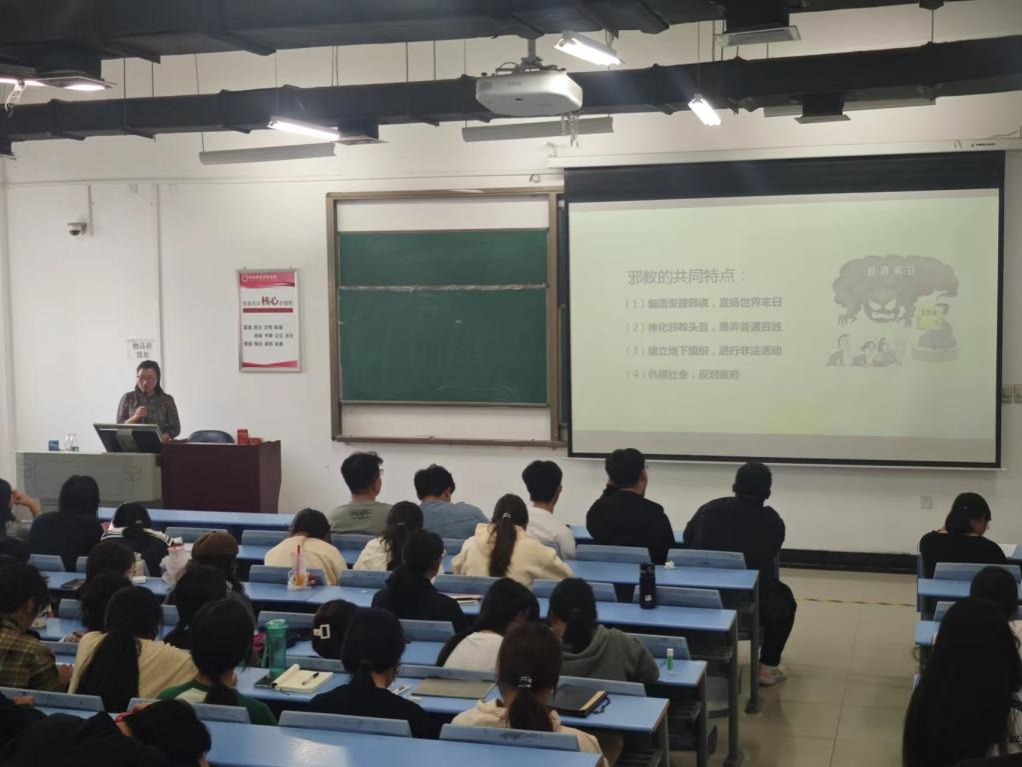 会上,李江红详细介绍了宗教的起源、马克思主义宗教观、国家的宗教政策、当代大学生树立正确的宗教观等内容。并通过生动的案例向同学们阐明了非法宗教活动的危害以及宗教渗透对大学生成长的潜在影响。李江红指出,大学校园是一个开放而包容的环境,但也必须警惕外部宗教势力的介入,同学们要具备清晰的认识,树立正确的国家观、民族观、宗教观和文化观,抵制任何形式的宗教渗透,以维护校园的安全与稳定。活动后,同学们纷纷表示将在今后的学习和生活中,自觉遵守国家的宗教政策法规,积极弘扬社会主义核心价值观,为构建和谐校园、和谐社会贡献自己的力量。