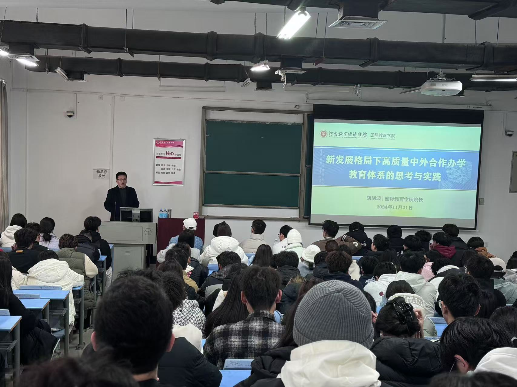 为帮助学生全面了解学校中外合作办学项目,提前规划未来发展路径,进一步增强爱校爱院意识,11月28日下午,beat365英国官方网站院长胡晓波以《新发展格局下高质量中外合作办学教育体系的思考与实践》为题,分别于和英才校区学术报告厅和龙子湖校区合100教室为2024级新生作专题报告。