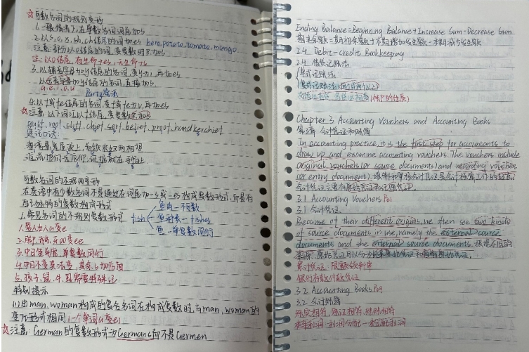 活动期间共收到三十余份课堂笔记,这些笔记内容丰富、形式多样。有的同学用不同颜色的笔标记出重点难点,条理清晰;有的同学绘制知识卡片,将知识点串联整合,逻辑严谨;有的同学在旁边附上了自己的思考感悟与疑问总结。通过评选,23国教会计(专)04宗珈如获得一等奖,23国教电商(专)03何思璇等3名学生获得二等奖,24国教物流(霍尔姆斯)01班张佳等5名学生获得三等奖。