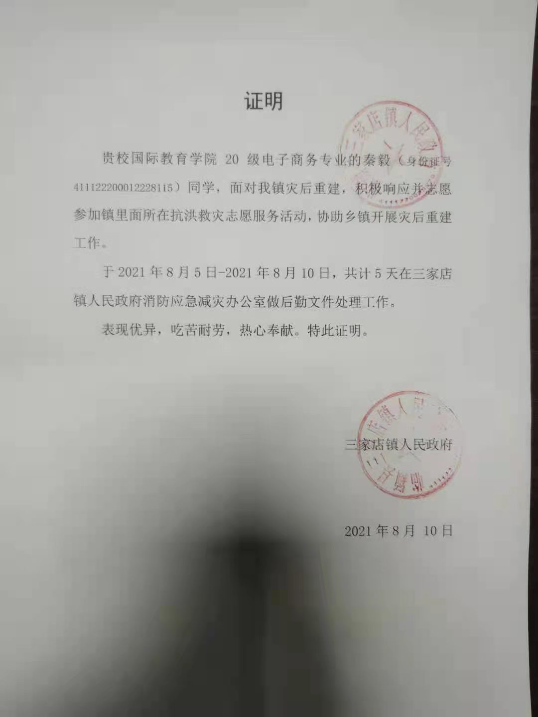 恰逢暑假之际,席卷而来的一场暴风雨遍布河南以及周围各部地区,致使多个辖区内多条道路出现积水,多个村庄被淹。防汛工作紧急而又艰巨,我院20级电子商务03班的秦毅同学在抗洪防汛期间积极参加志愿者工作中,为自己的家乡贡献一份力量。作为一名充满希望与未来的大学生,在保护自己的同时,尽他所能做力所能及之事来帮助他人,在干部的领导下,开始了防汛后勤处理工作,秦毅同学主要负责对各村庄,各管辖区域受灾情况进行一个了解,并对村庄受灾情况进行一个分级规划管理,并制作成文件,分类汇总。
