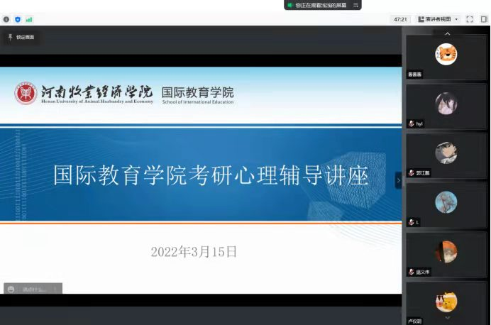 为助力2022届毕业生备战考研复试,缓解备考压力,3月15日晚上,beat365英国官方网站通过腾讯会议举办线上专题心理讲座,为考研复试学子答疑解惑、调整心态。此次讲座由学院心理专干、国家二级心理咨询师何季霖老师主讲,学院30余名考研复试学生参加此次讲座。