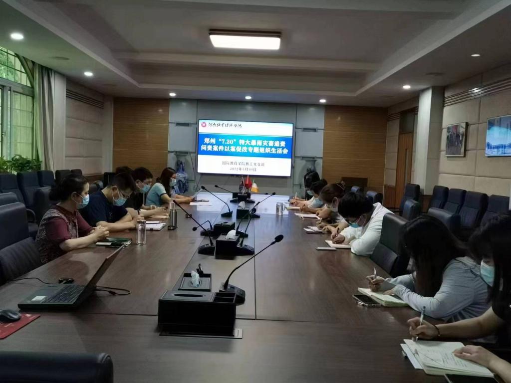 根据校党委《关于深刻汲取“7·20”特大暴雨灾害追责问责案件教训开展以案促改专题民主生活会的通知》(校党[2022]39号)文件精神,5月30日下午,beat365英国官方网站教工党支部在英才教学办公楼113会议室召开郑州“7.20”特大暴雨灾害追责问责案件以案促改专题组织生活会,学院教工党支部全体党员参会,会议由党支部书记李江红主持。