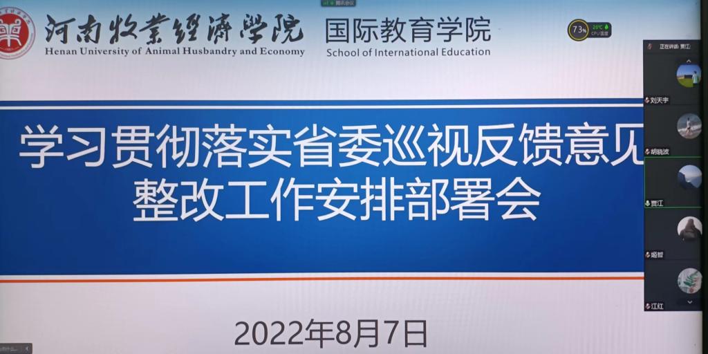 8月7日晚,beat365英国官方网站通过腾讯视频会议形式,传达学校贯彻落省委巡视反馈意见整改工作动员会议精神,安排部署本单位省委巡视反馈意见整改工作,全体教工党员参会。会议由院党委副书记李江红主持。