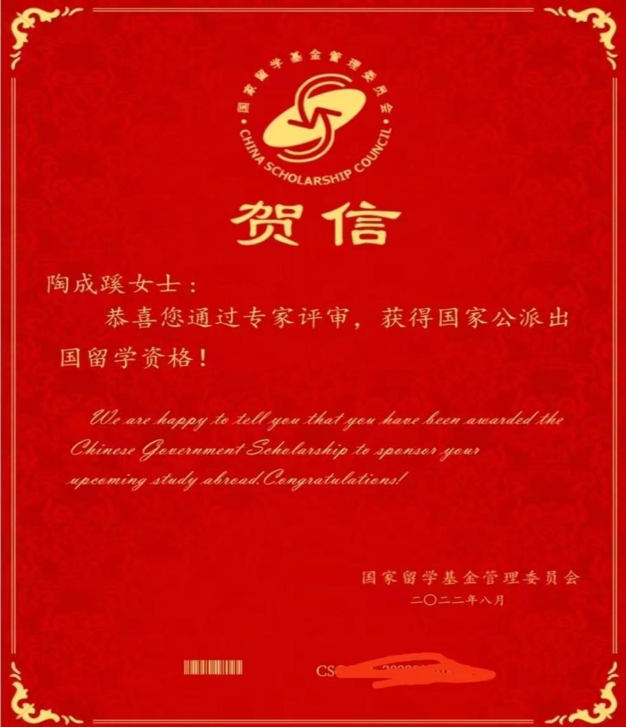 陶成蹊获得国家公派留学资格