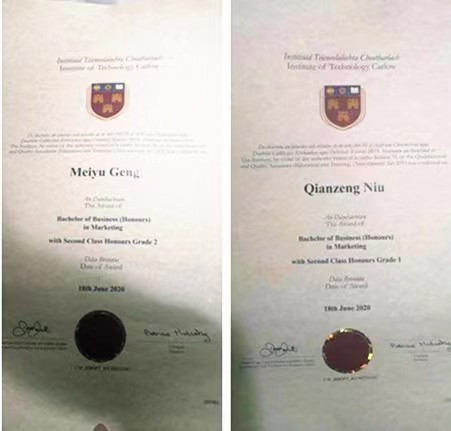 牛茜增、耿美雨获得爱尔兰卡洛理工学院学位证书