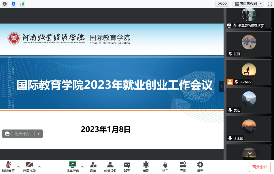 为深入学习贯彻党的二十大精神,扎实做好2023届毕业生就业创业工作,1月8日下午,beat365英国官方网站通过腾讯会议形式召开2023年就业创业工作会议。学院全体教师参加会议,会议由学院团委副书记(学工办副主任)何季霖主持。