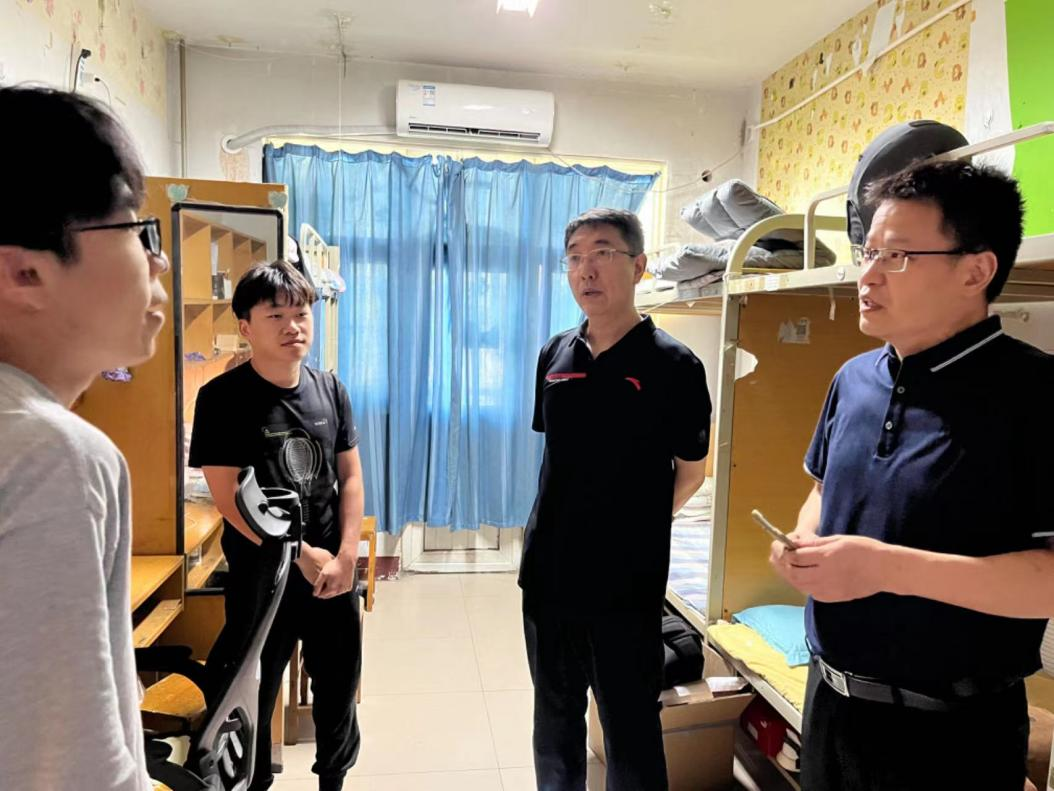 贾江、胡晓波一行逐一走访了留校学生宿舍。每到一处,他们同留校学生深入交流,关切询问了解大家食宿情况和学习计划,耐心倾听同学们的意见建议,对同学们刻苦学习的进取精神给予肯定,并提醒同学们科学合理安排作息时间,做到劳逸结合;要不断提高安全防范意识,做好高温天气防暑和防范强对流天气;要遵守暑期学生留校管理相关规定,保持信息畅通,遇到问题及时与学院和辅导员老师反馈。