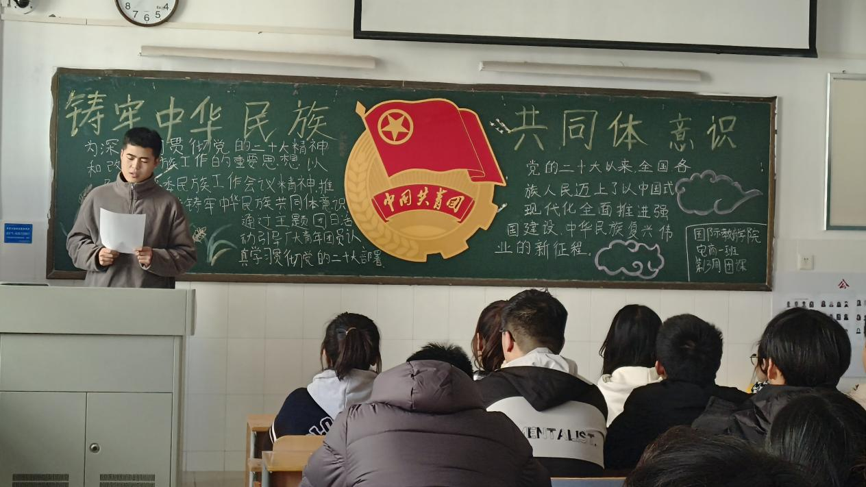 团课上,23级电商01班主持人魏畅通过讲解民族团结共同繁荣的发展历史,播放了疫情期间各省人民共同抗“疫”并取得成功等方式让大家认识到了团结的重要性,并鼓舞本班优秀团员进行发言,为大家讲解了从中国被侵略到礼赞新中国,都离不开中国人民集中力量办大事的发展思想,让同学们深刻体会到了加强中华民族大团结才是中国发展的长远和根本。之后团支书为大家讲解了培养中华民族团结意识要增强文化认同,要将本民族文化的热爱融入对整个中华文化的热爱中,各民族要相互理解,相互尊重,增进文化认同,各族人民才能抱的更紧,之后团支书带领同学们共同观看了共青团中央的公益宣传片《青春》,成立了青年大学习督促小组,让同学们及时的学习青年大学习思想内容,营造互帮互助共同进步的班级氛围,让大家深刻体会到凝聚共同体意识的重要性。