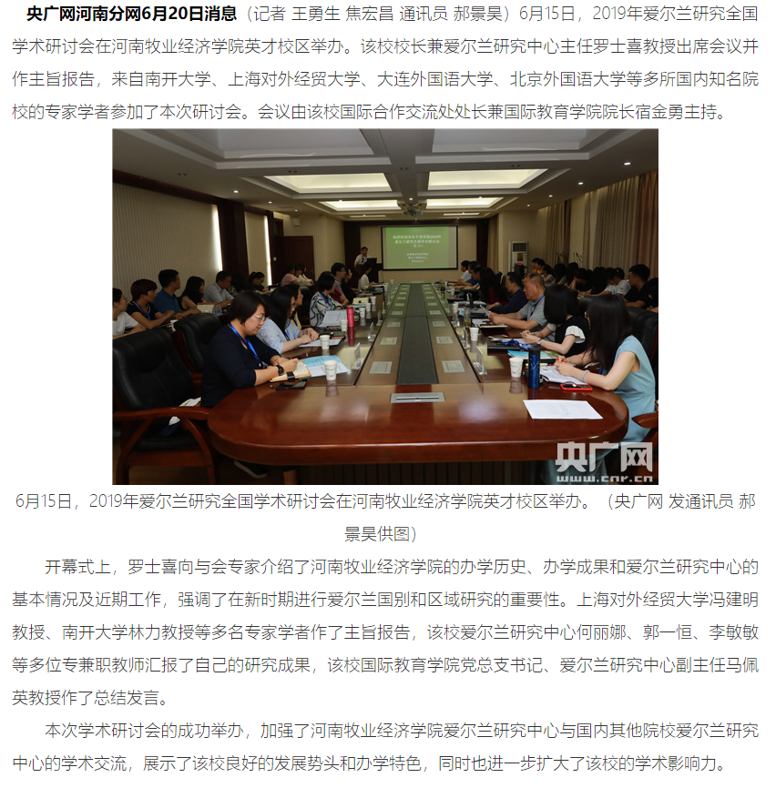 2019年6月15日beat365官网成功举办了2019年爱尔兰研究全国学术研讨会,以下是央广网对会议的具体报道。