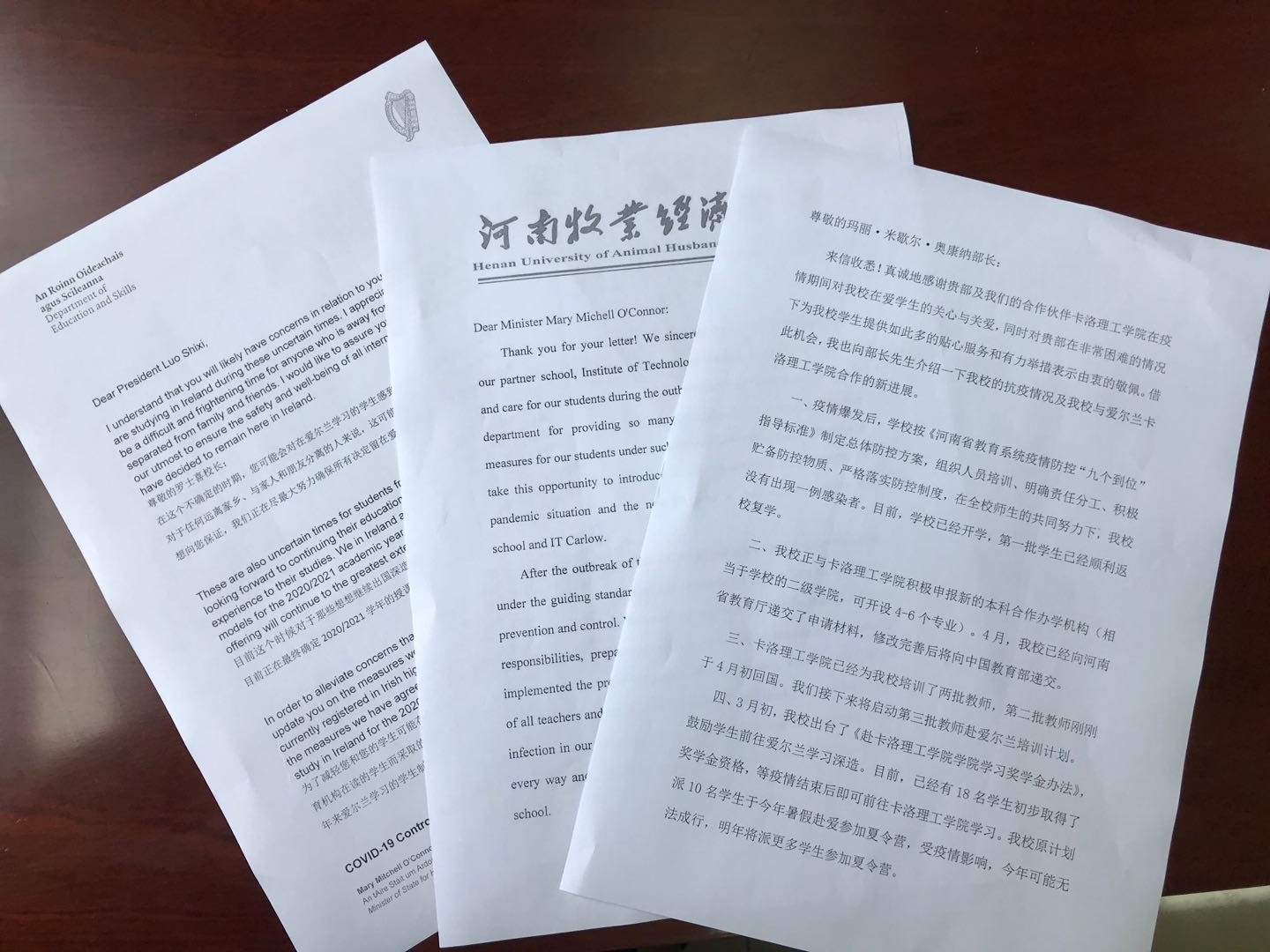 随着疫情在国外的蔓延,校领导十分关心、关注beat365官网在外学习生活的师生情况。此时,爱尔兰高等教育国务部长玛丽·米歇尔·奥康纳先生给校长罗士喜写来了一封信,缓解了校领导的担忧。