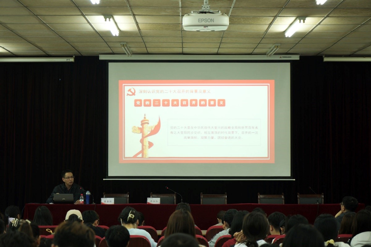 董金柱首先阐述了党的二十大召开的背景、意义和基本概况,然后围绕“奋斗新时代、贯彻新思想、挚画新蓝图、启航新征程”四个方面,深入解读了党的二十大报告,重点就“新时代十年伟大变革的重大意义” “开辟马克思主义中国化时代化新境界” “新时代新征程中国共产党的使命任务”“实施科教兴国战略,强化现代化强国人才支撑”等内容与师生进行了分享交流,加深了与会人员对党的二十大精神的理解和感悟。他勉励青年学生要坚定理想信念,弘扬伟大建党精神,自信自强、守正创新,踔厉奋发、勇毅前行,争做有理想、敢担当、能吃苦、肯奋斗的新时代好青年,为全面建设社会主义现代化国家、全面推进中华民族伟大复兴贡献青春力量。