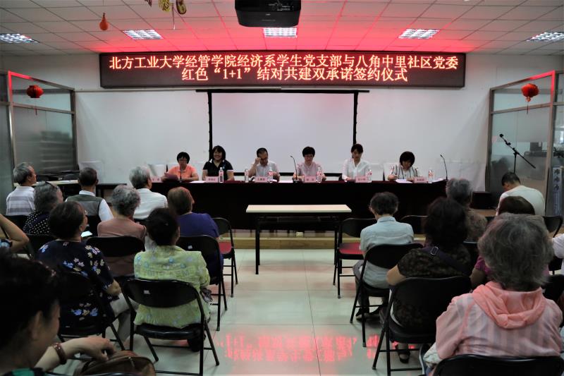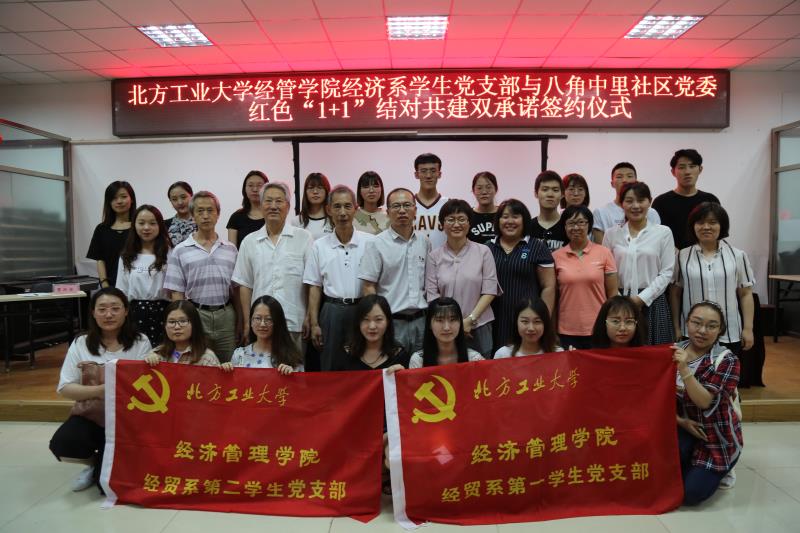 2018年6月7日下午3点,350vip8888新葡的京集团经济系第一、第二学生党支部与石景山区八角中里社区党委“红色1+1”结对共建双承诺签约仪式在八角中里社区会议室举行,八角街道工作委员会副书记王建强,八角中里社区党委书记李美红、副书记王君,八角中里社区党委成员与社区党员,350vip8888新葡的京集团党委副书记赵洁、经济系第一学生党支部书记赵晓男、经济系第二学生党支部书记白小伟以及经济系14、15、16级部分学生党员出席了本次活动。