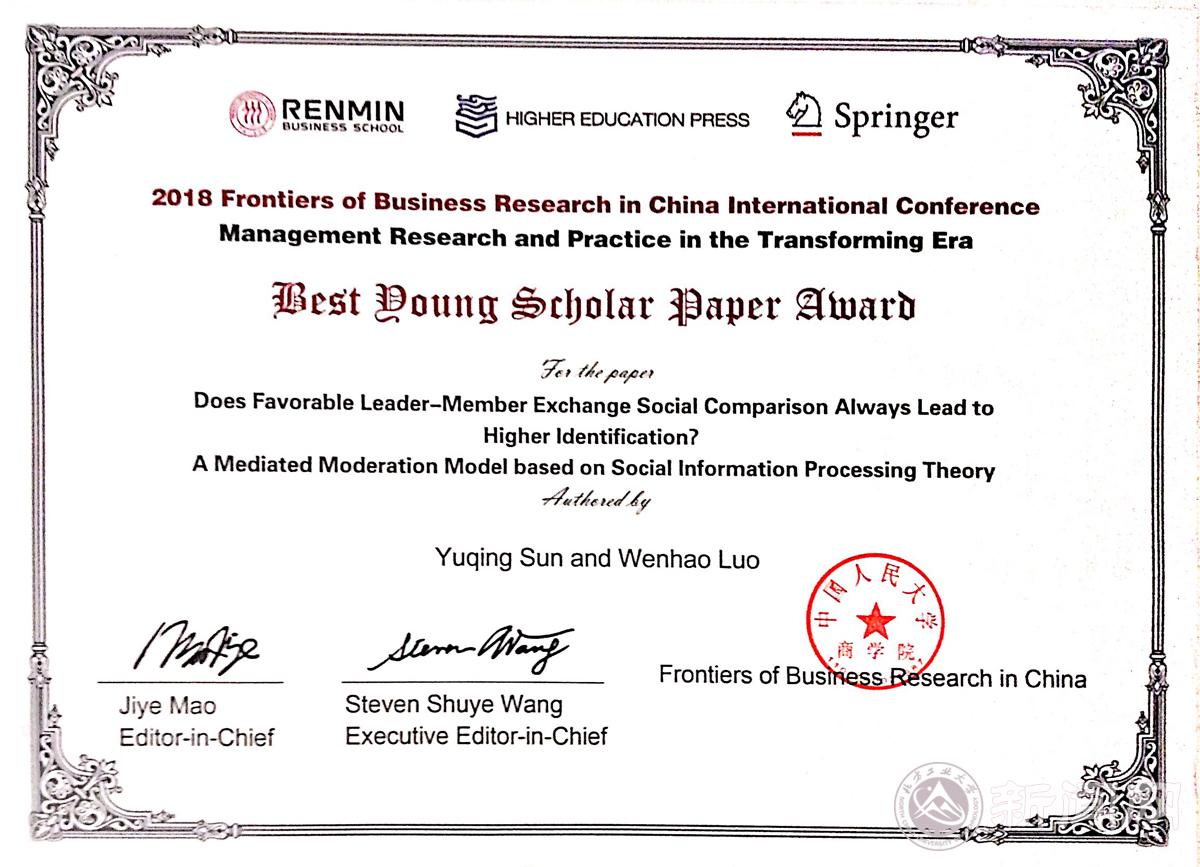 在本次会议中,新葡的京官网经管院工商管理系罗文豪博士在“领导力”分论坛上报告了他与合作者的研究成果,并喜获FBR国际会议“最佳青年学者论文奖”(Best Young Scholar Paper Award)。