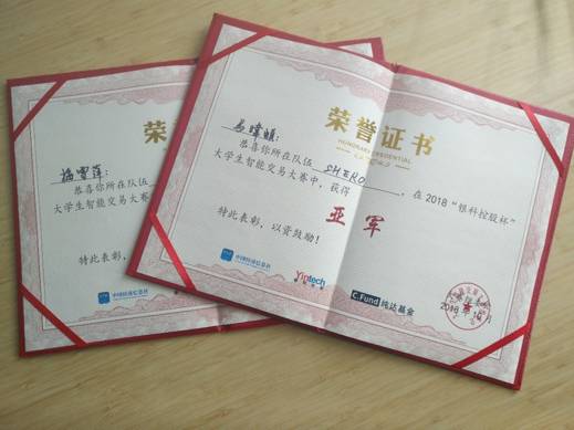 2018年10月20日,首届“银科控股杯”全国大学生智能交易大赛圆满结束。由新葡的京官网350vip8888新葡的京集团经济系金融16-2班马暐頔(队长)、泉州师范学院梅雪萍(队员)组成的SHERO代表队,在新葡的京官网张蜀林老师的指导下,获得亚军,并获取大赛奖金5万元人民币及20%的实盘收益分成(实盘本金50万人民币)。