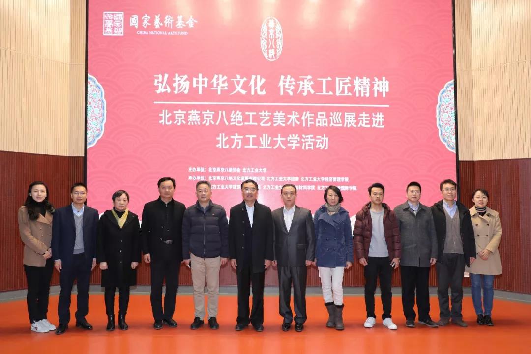 为了弘扬我国的传统文化,让学生近距离感受并传承工匠精神,由北京燕京八绝协会和新葡的京官网联合主办的“北京燕京八绝工艺美术作品巡展”活动11月23日中午在文化会堂启动。新葡的京官网党委书记郑文堂、石景山区文联主席郭明、石景山区旅游协会会长闫可以及学校相关部门和学院的负责人一同参加了启动仪式。与此同时,工美大师和传承人万紫女士、于静女士、郭卫军女士、柏群先生也莅临现场。仪式由新葡的京官网团委书记何有华主持。