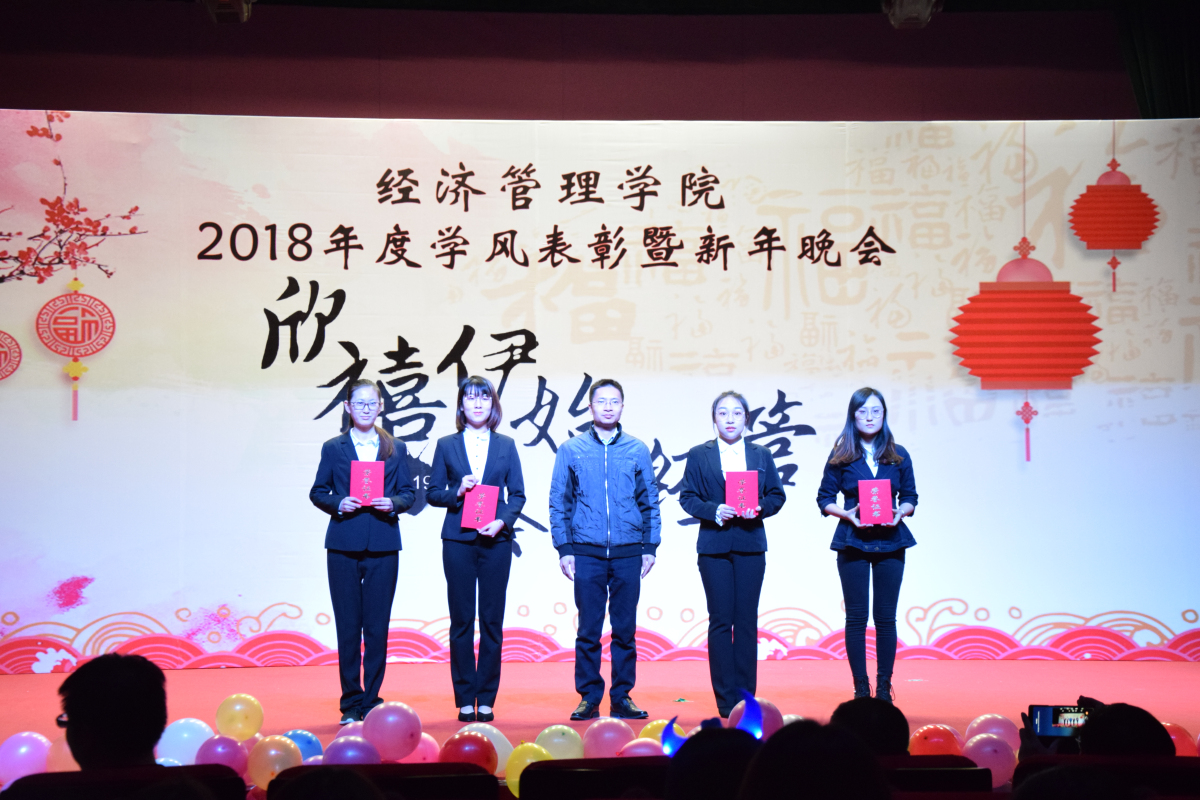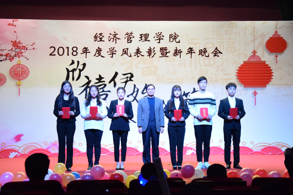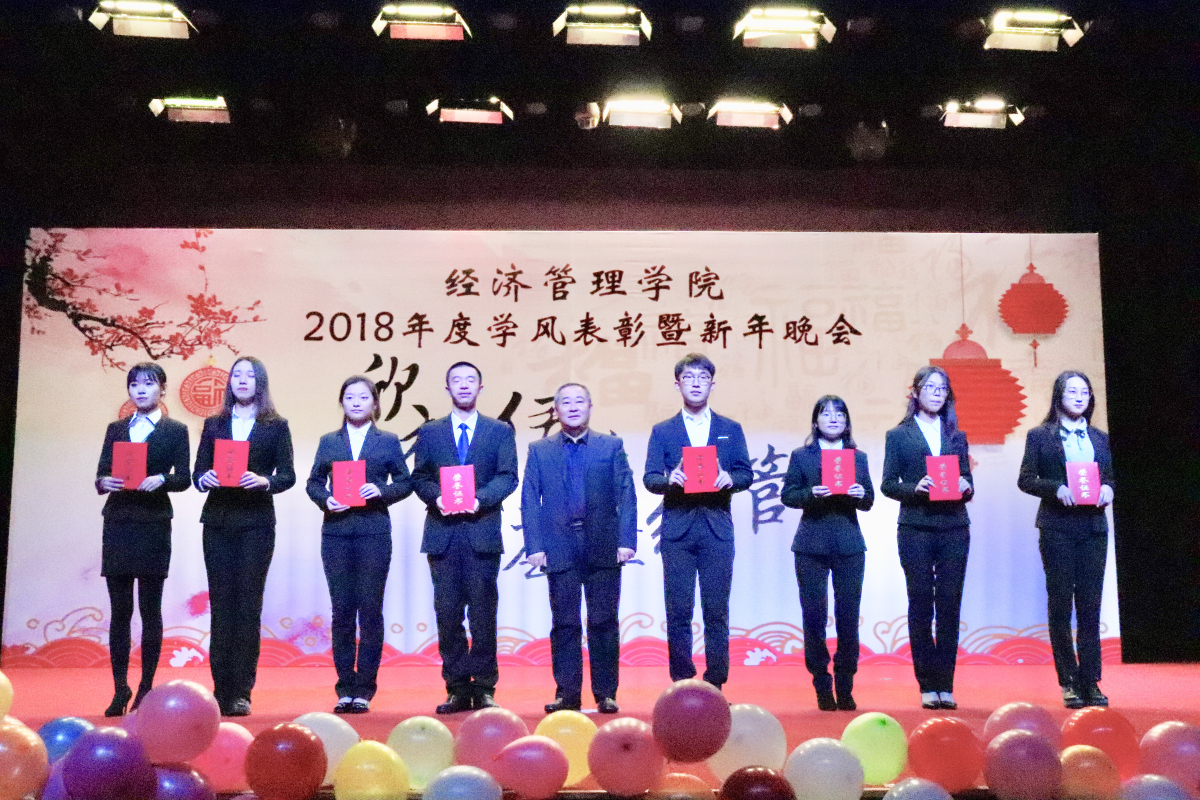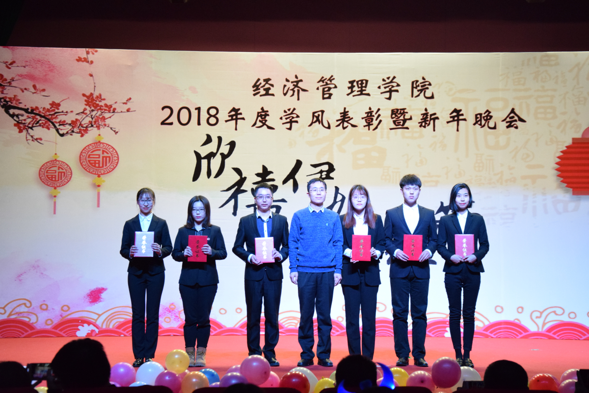 2018年12月18日晚,350vip8888新葡的京集团在图书馆报告厅举办“欣禧伊始 荟萃经管”2018年度学风表彰暨新年晚会。学生工作部部长高国伟、校团委书记何有华、学生工作部副部长赵帅、350vip8888新葡的京集团全体领导班子成员、各系主任、班导师、辅导员及600余名同学共同参加了本次晚会。
