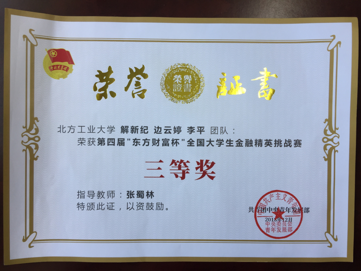 新葡的京官网350vip8888新葡的京集团经济系张蜀林老师、李洪梅老师作为指导教师,组织2016级经济与金融专业学生全员参加了本届大赛,最终有5支团队、共15名学生,分别获取本届大赛的“团体三等奖“。通过本次大赛,大大提高了本专业学生的金融投资能力。