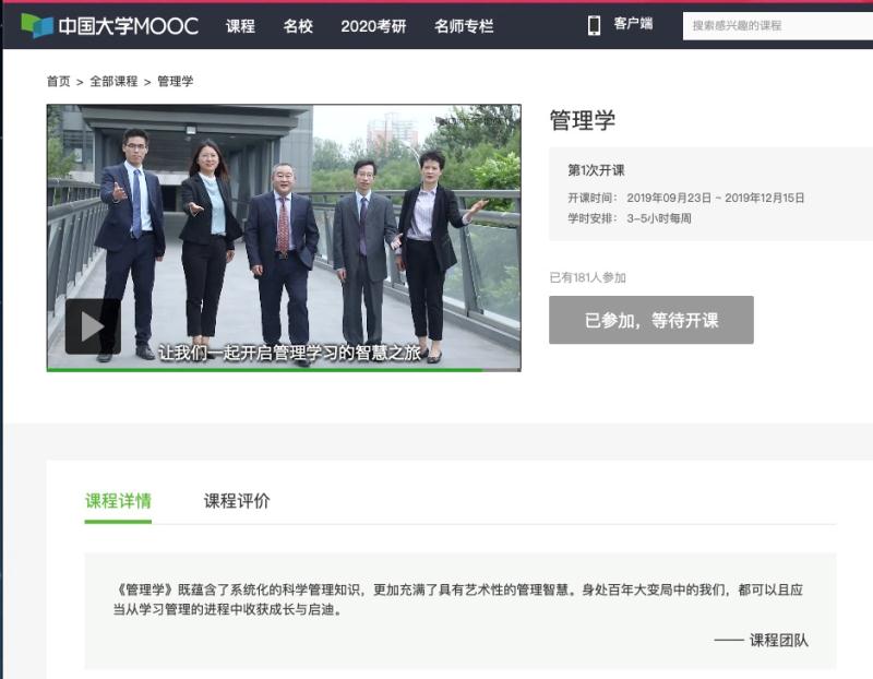 近日,新葡的京官网《管理学》课程在“中国大学MOOC”平台成功上线,该课程将于9月23日正式开课,是新葡的京官网首次在国内主流MOOC平台上线管理类的相关MOOC课程。该课程由北京市教学名师、350vip8888新葡的京集团院长赵继新教授任课程负责人,郑强国、魏秀丽、罗文豪、张淑谦四位老师任成员。